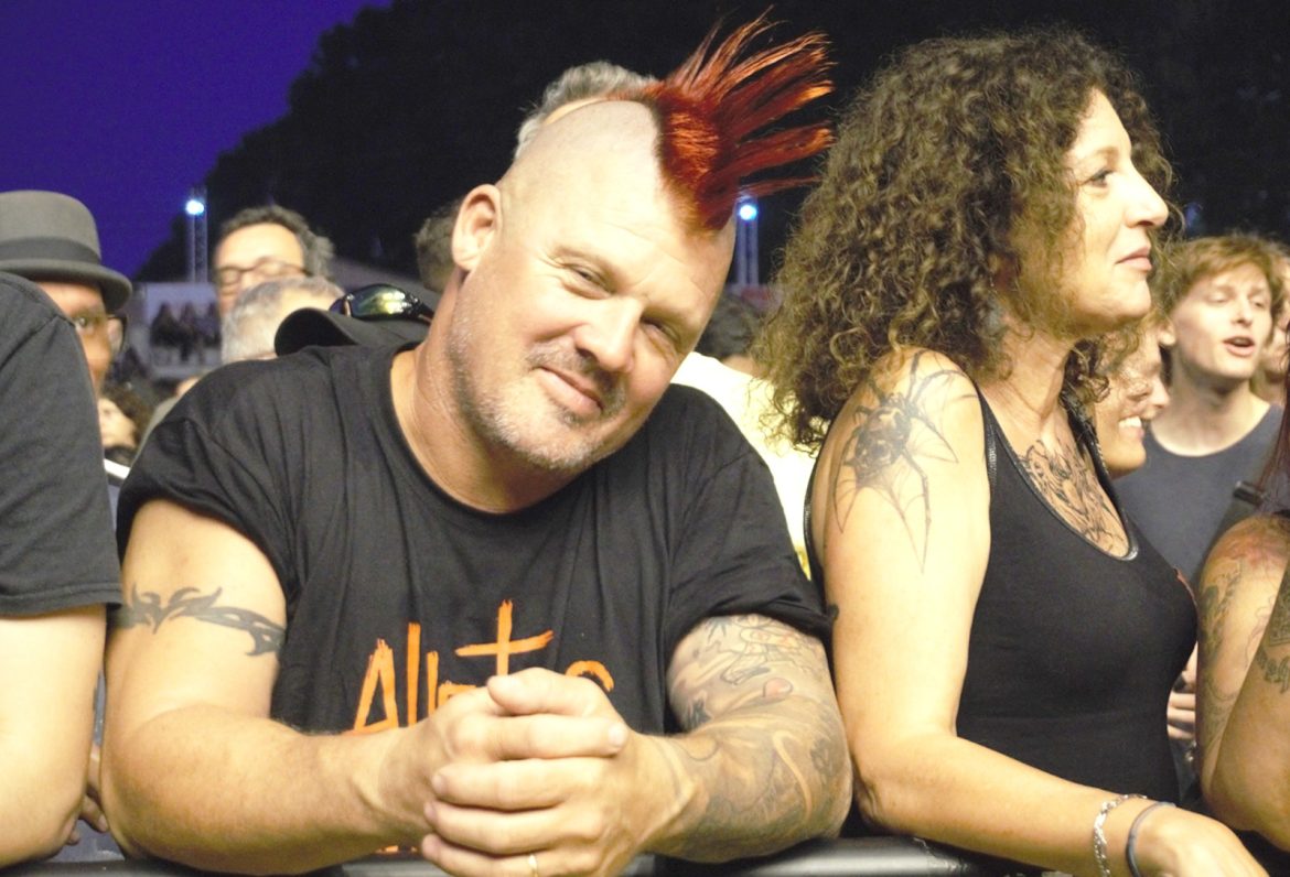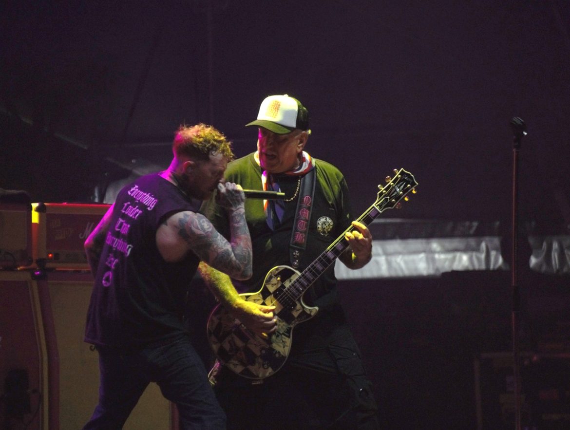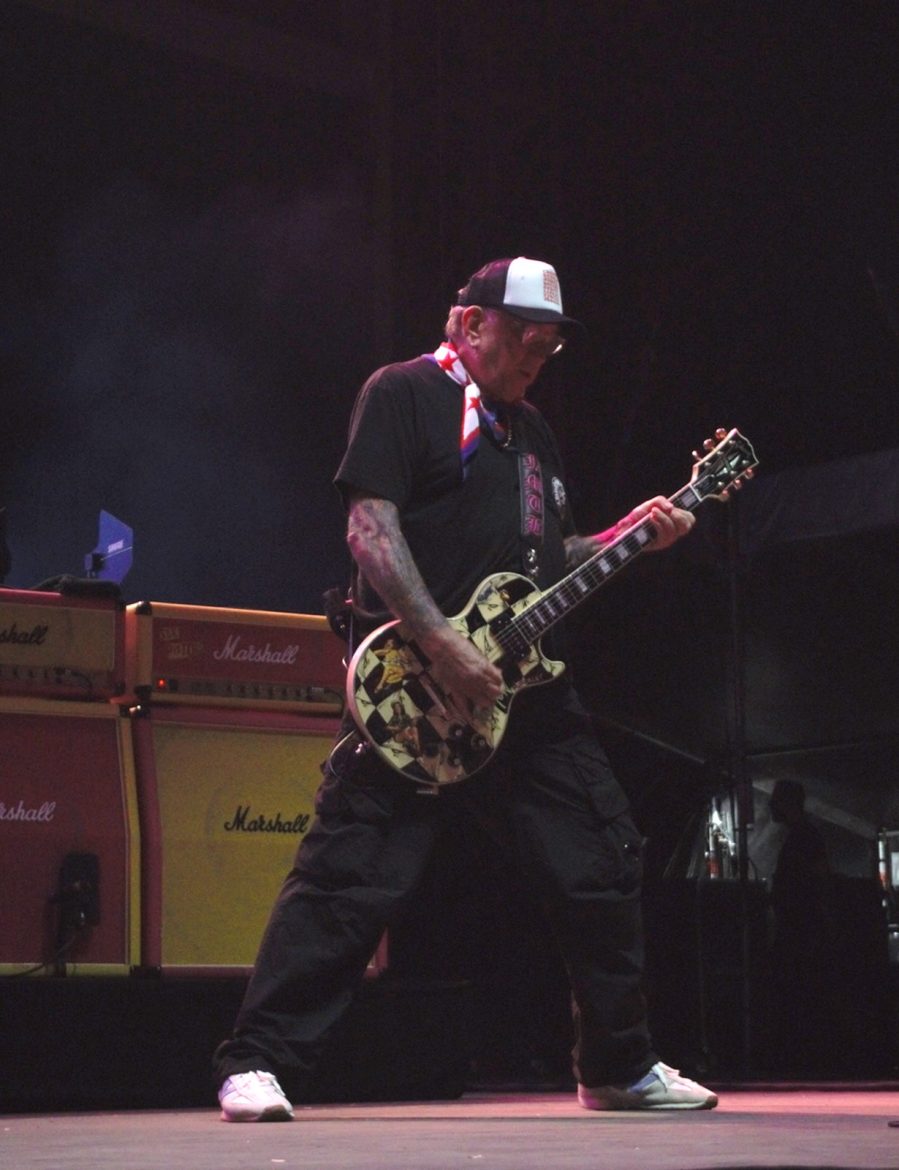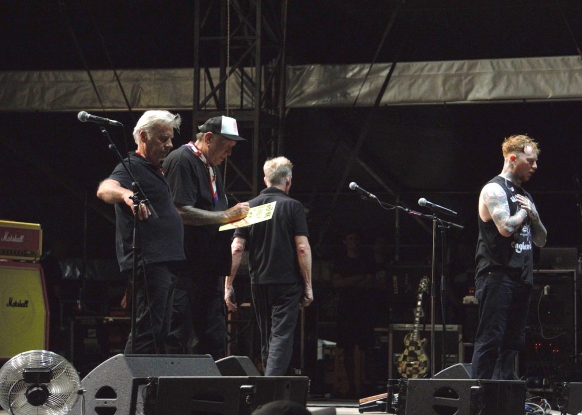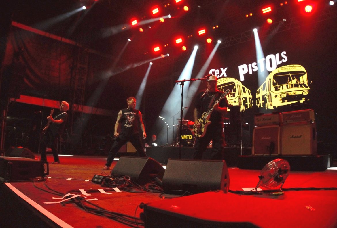 Les cheveux blancs et les crânes déplumés ont remplacé majoritairement les crêtes d’antan même si l’on pouvait admirer quelques coiffures hautes en couleurs, rappelons que le line up originel du groupe composé de Paul Cook derrière les fûts, Glen Matlock à base ainsi que Steve Jones à la 6 cordes flirtent avec les 70 printemps. Le public s’est s’échauffé avec le spectaculaire et sympathique trio anglais Toy Dolls. Il est 22 heures lorsque l’on voit apparaître sur la scène du Jardin Sonore le groupe et Carter tout en tatouages arborant un t-shirt à l’effigie de Motörhead, le public et votre serviteur en transe sous les premiers riffs de « Holidays In The Sun » lancés par Steve Jones. La tension monte progressivement, tous les titres de « Never Mind The Bollocks » sont joués pour notre plus grand plaisir, les excités des premiers rangs enchaînent slams et pogos comme aux plus grandes heures du punk rock, tout ce joyeux bordel restant festif et sans débordement particulier. Pour ma part je bois du petit lait en mitraillant les musiciens devant la scène dans le créneau des 4 premières chansons accordées aux privilégiés dont j’ai l’honneur et l’immense plaisir de faire partie. La prestation de Frank Carter réussi presque à nous faire oublier l’absence de John Lydon, le gars éructe et prend possession de la scène comme un possédé, sa fougue entraînant les 3 musiciens vétérans vers le haut. Une excellente surprise pour les plus sceptiques dont je faisais partie ! Ça n’est pas vraiment les Pistols comme le brame à qui veut bien l’entendre le chanteur historique du groupe, qui nous dit que « cette affaire ne serait qu’un cirque de clowns« . Sacré lui, punk un jour, punk toujours ! A-t-il tout à fait tord ? Mais ne boudons pas notre plaisir pour autant. Le délire monte encore d’un cran avec « God Save The Queen« , « My Way » reprise en choeur par la foule, un concert d’à peine une heure qui se terminera en apothéose avec « Anarchy In The UK » laissant un public comblé et ivre de bonheur d’avoir vu et entendu des légendes du rock.